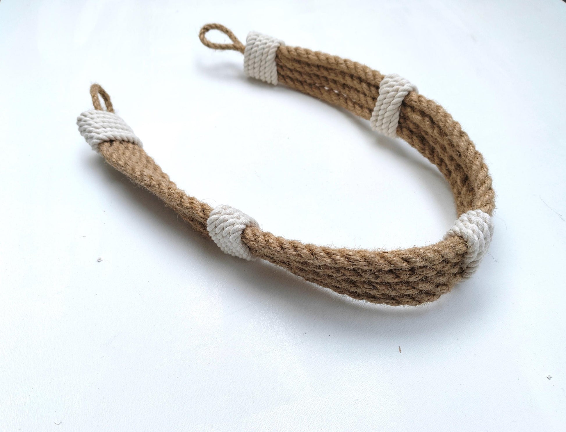 - Material: Natural jute rope with white cotton wrap